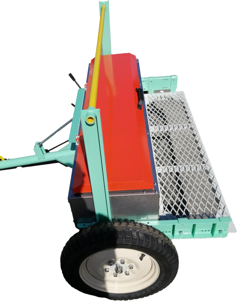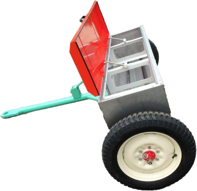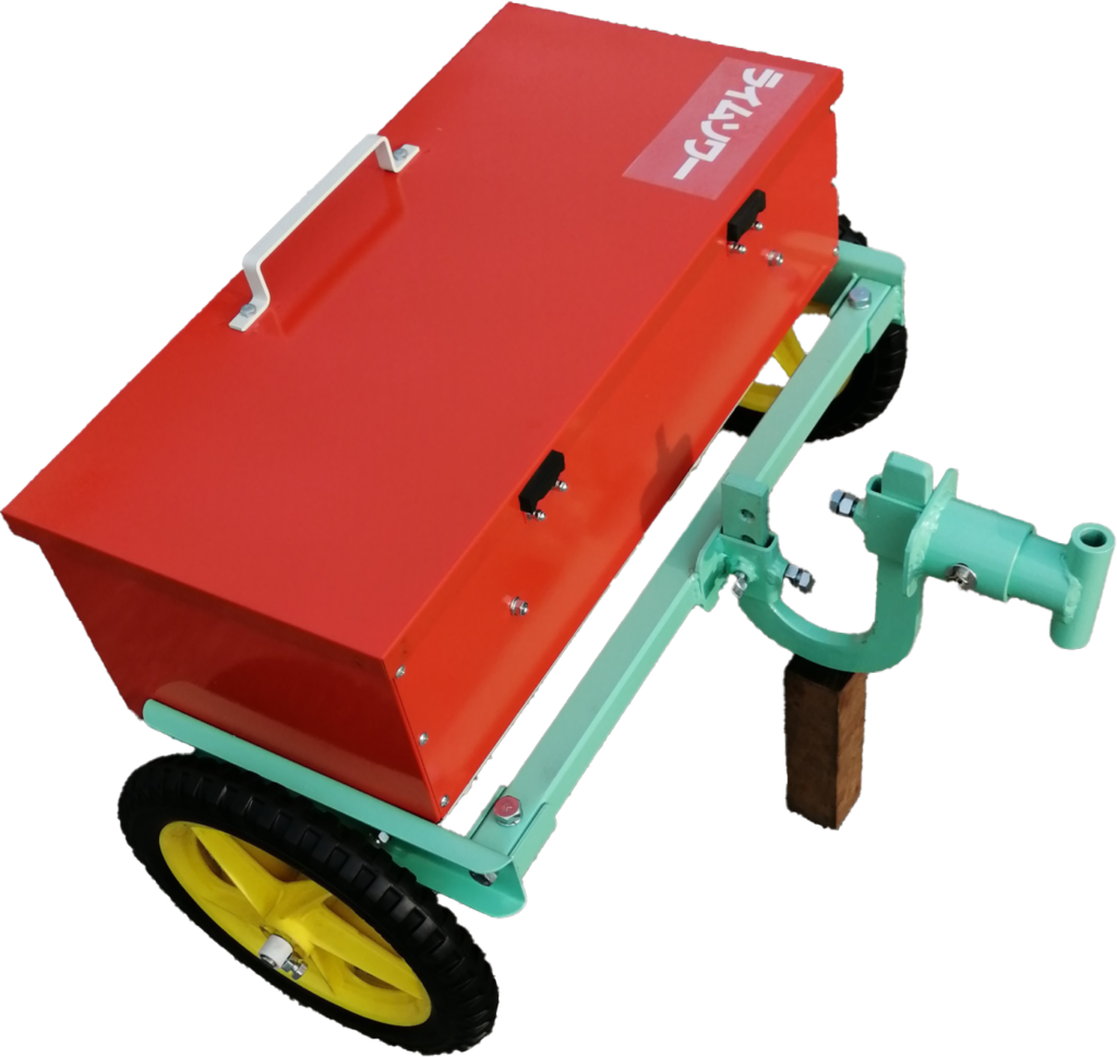 管理機で牽引するタイプの散布機です。簡易的に乗ることができるステップが特徴です。